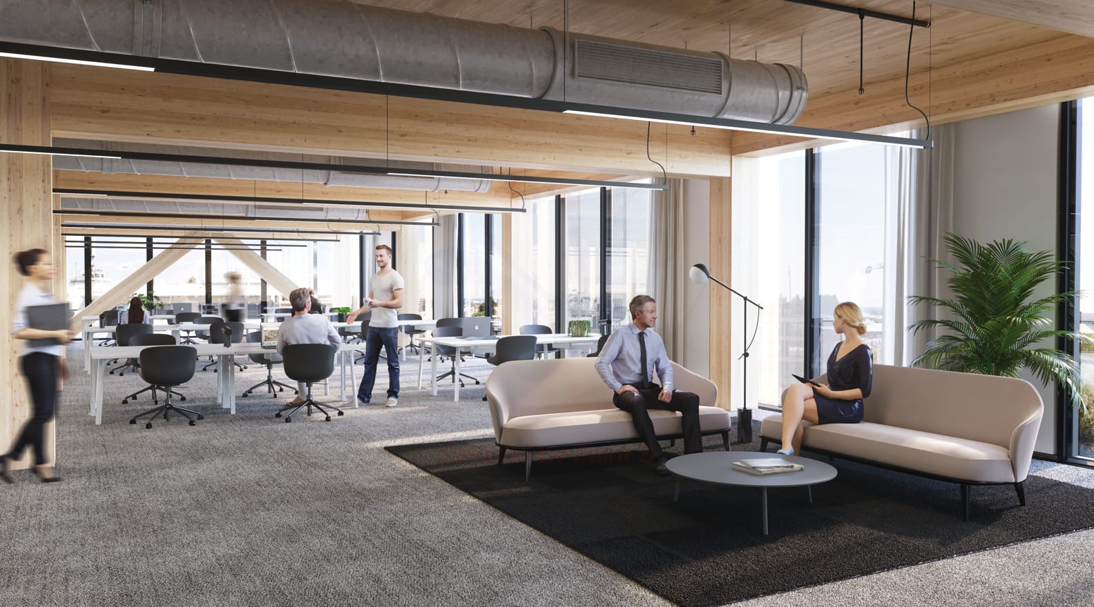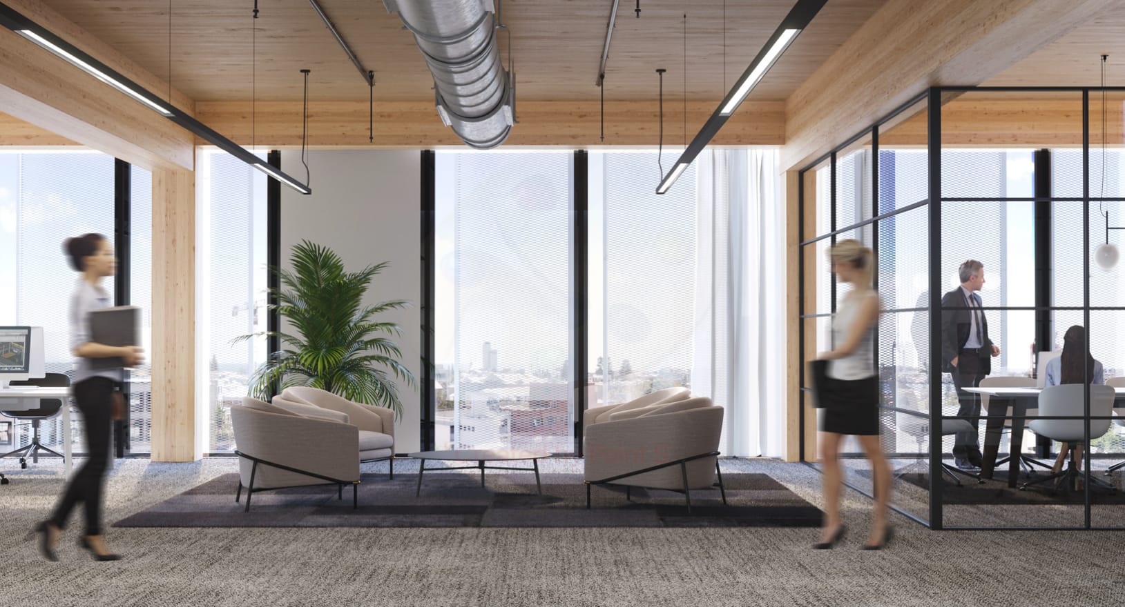 Located at 12 Josephson St, Fremantle WA, the Harbour Green Hub is designed to be a green office space that prioritizes the well-being of its occupants. The six-storey building, under design, features a modern, high-performance glass facade and shading screens to optimize natural light while maintaining energy efficiency. Inside, the exposed timber elements foster a warm and inviting atmosphere that contributes to workplace well-being.